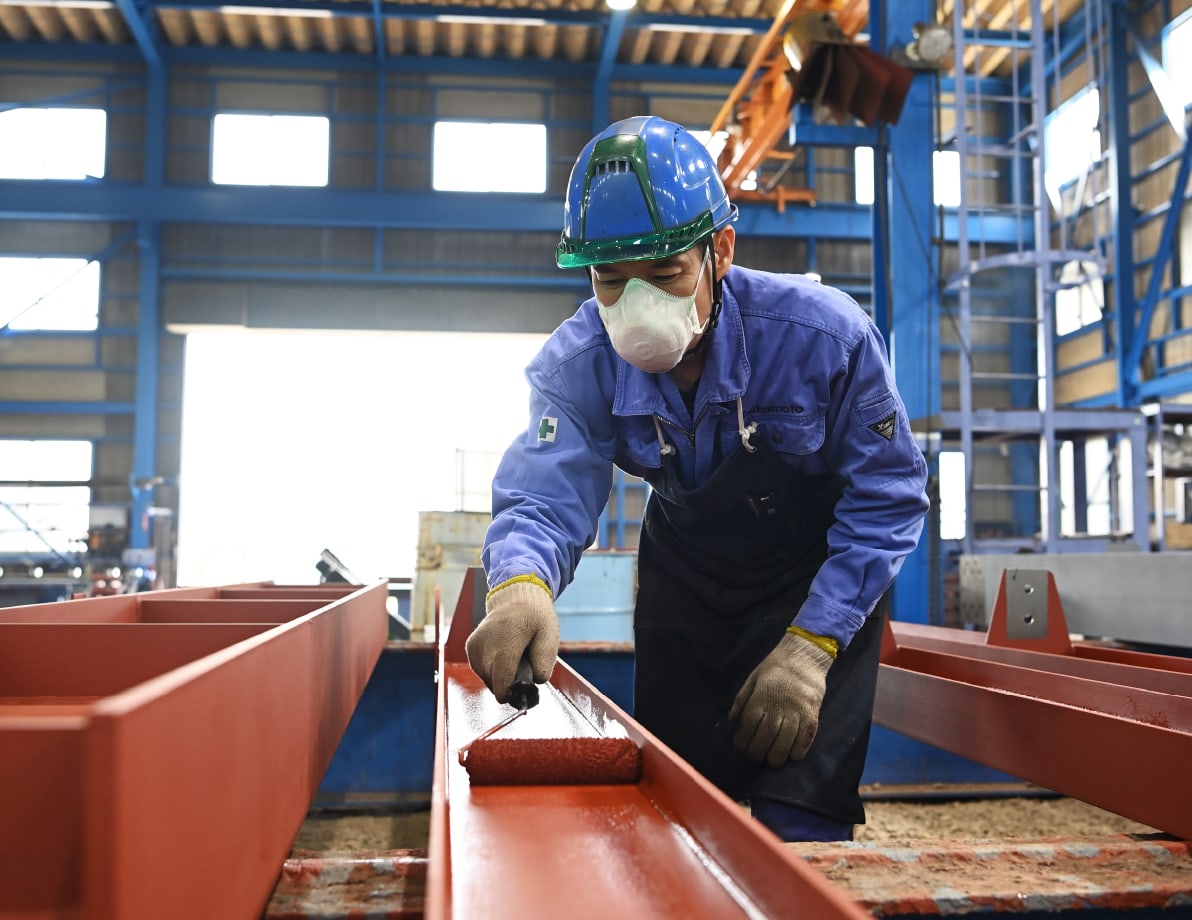 お客様による受け入れ検査が完了した後、鉄骨の劣化を防ぐためのサビ止め塗装が施されます。